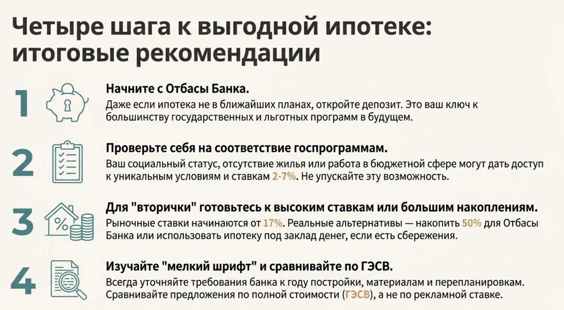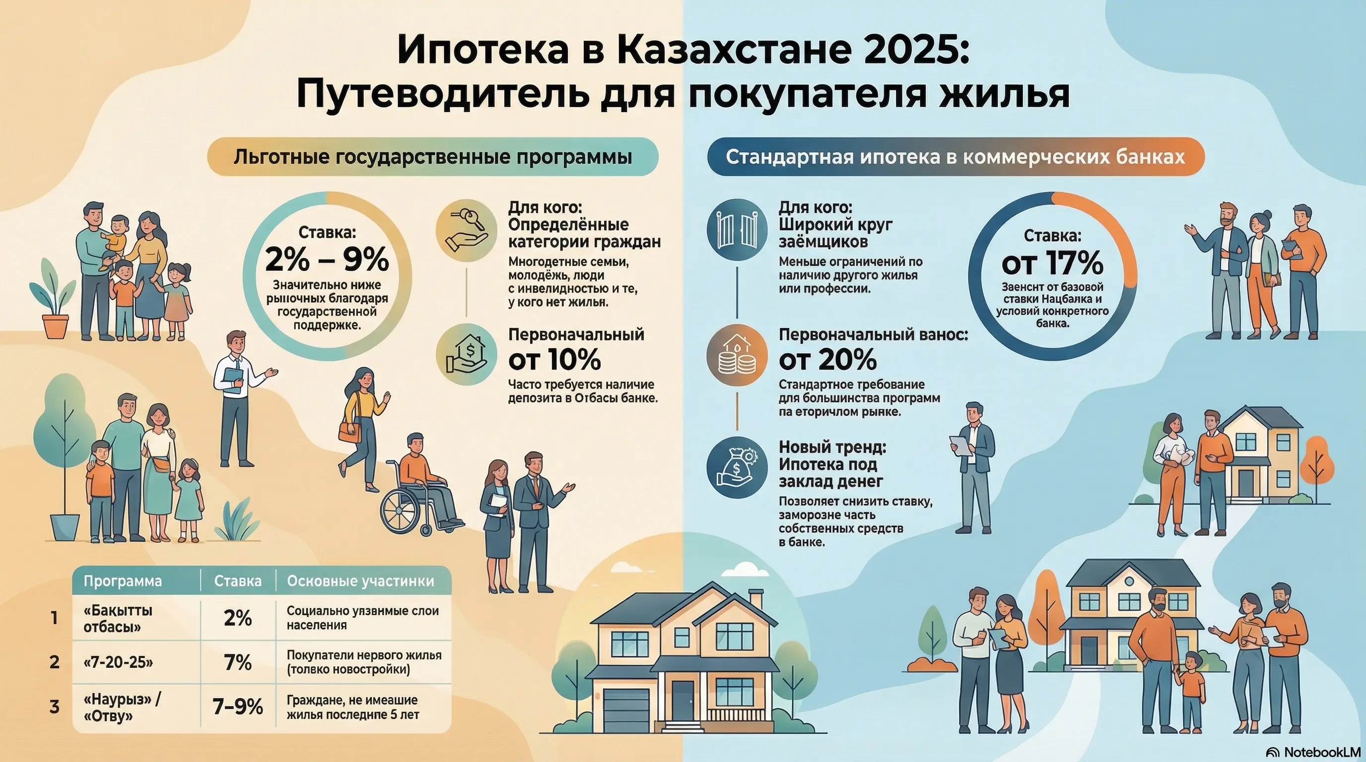 Государственные ипотечные программы, такие как «7-20-25», «Бакытты Отбасы», «Елорда Жастары», предлагают льготные условия для молодых семей, пенсионеров, госслужащих, военнослужащих и работников обрабатывающей промышленности. Они предполагают пониженную процентную ставку (от 2%) и минимальный первоначальный взнос (от 10%), что делает жилье доступнее.