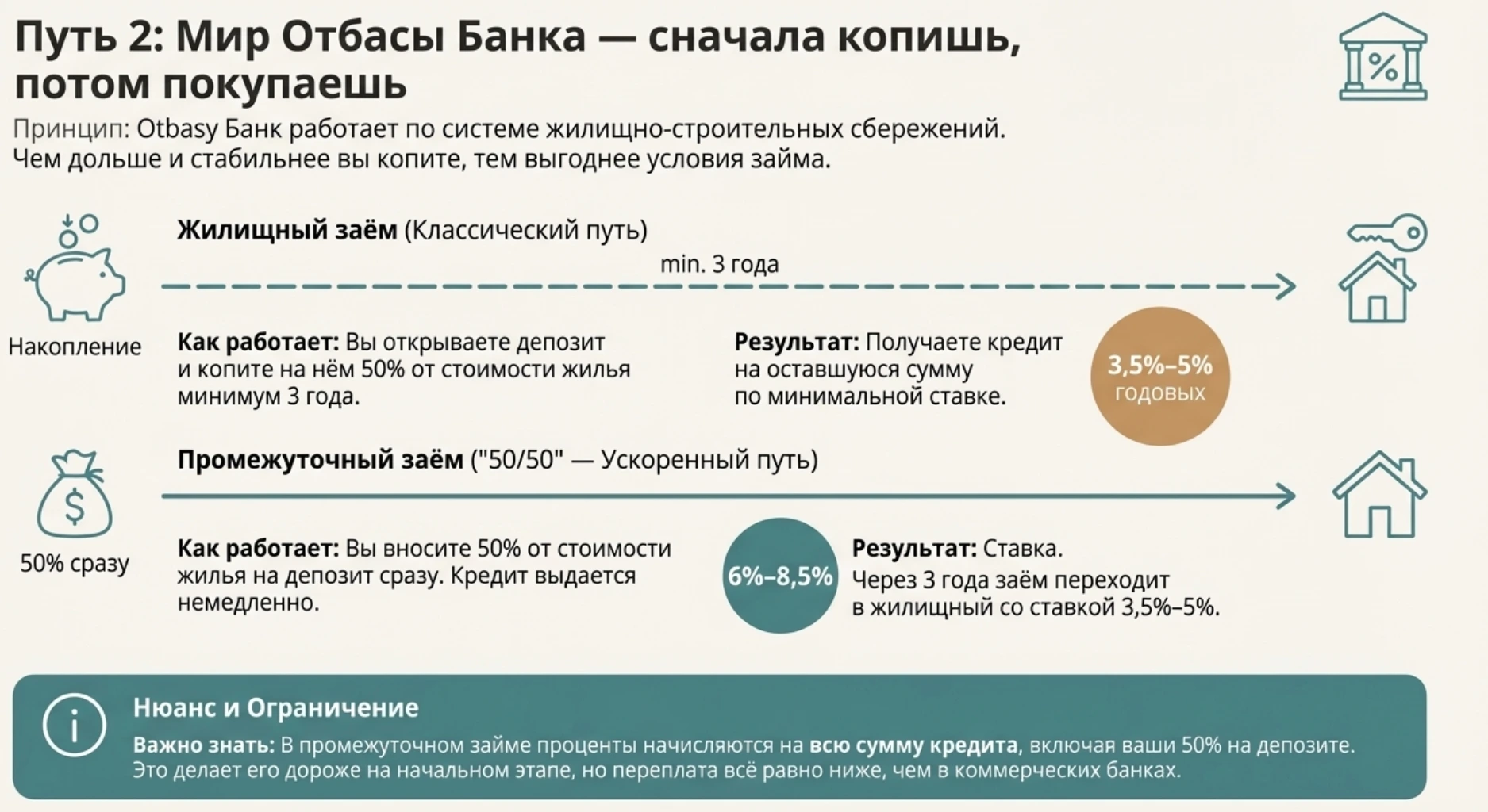 Этот вариант подходит для тех, кто хочет приобрести жилье в строящихся домах или уже сданных новостройках. Программы, такие как «Алматы Жастары» и «Отау», часто предлагают сниженные ставки, длительные сроки погашения (до 25 лет) и удобные условия. Однако заемщикам нужно учитывать риск задержки строительства и требования по подтверждению дохода.