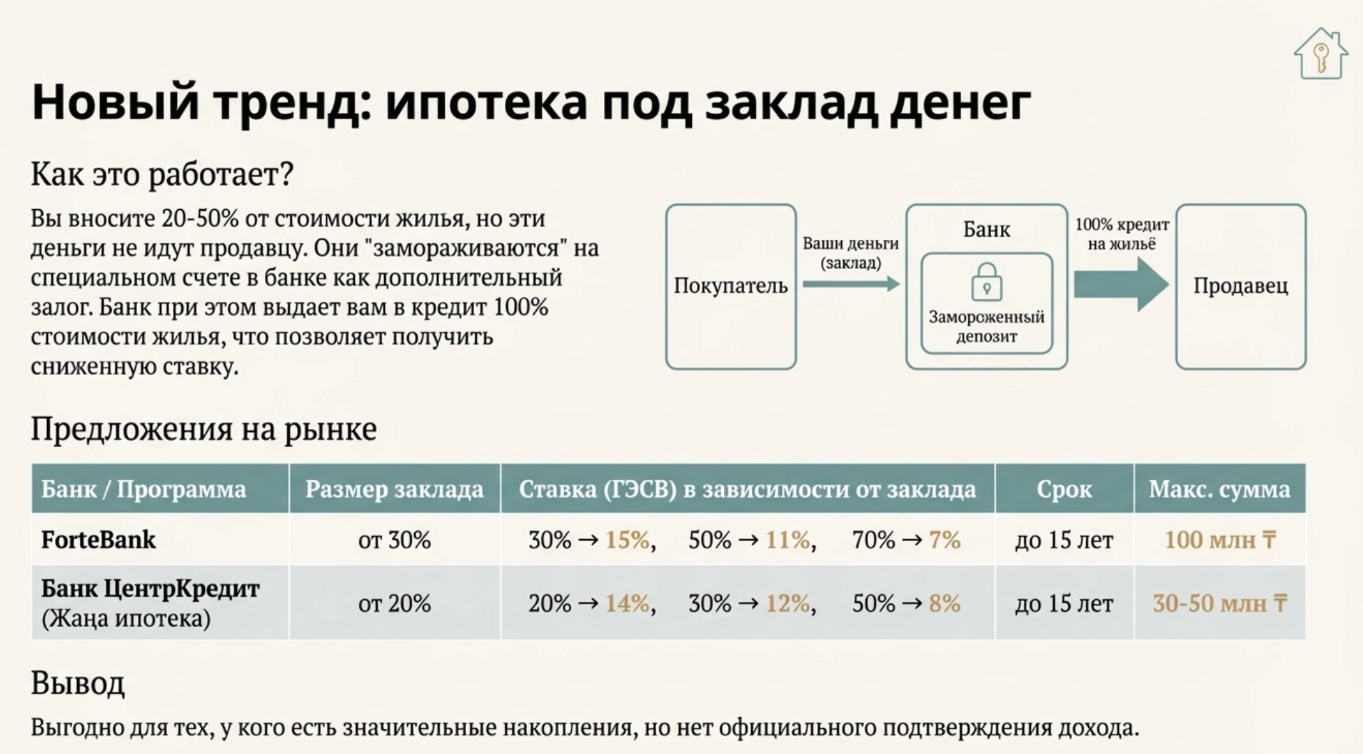 - Доступ к государственным программам: «7-20-25», «Алматы Жастары», «Елорда Жастары», которые предлагают сниженные ставки и привилегированные условия.